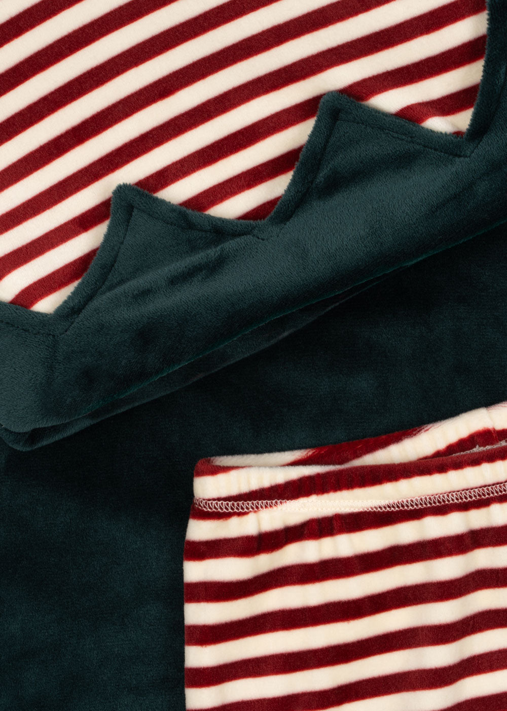 ふわふわのベルベット素材で、ブラウス、お揃いのパンツ、エルフの帽子が含まれています