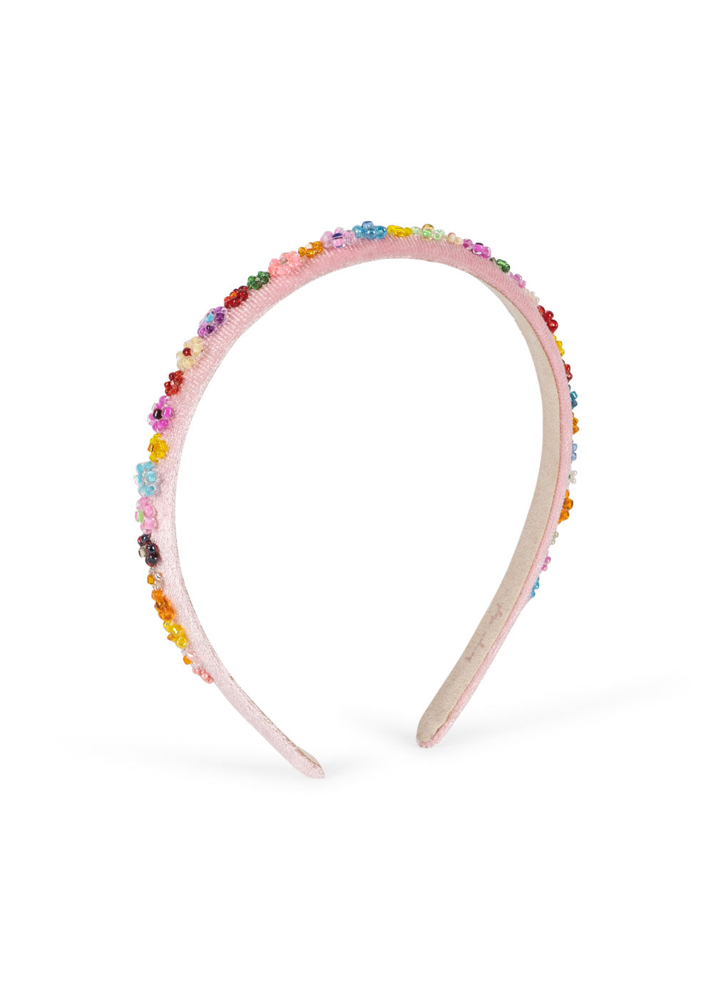 ピンクベースにビーズのカラフルなお花が素敵なカチューシャ